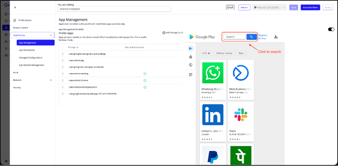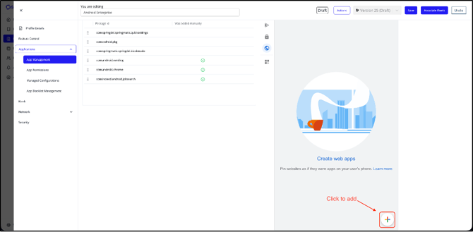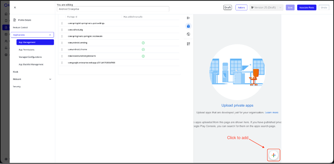 This section explains how to add and deploy apps to your Android Enterprise devices. You can manage public apps from the Google Play Store, upload private apps, create web apps, or organize apps into collections. All apps added to a profile will automatically install on devices associated with that profile.