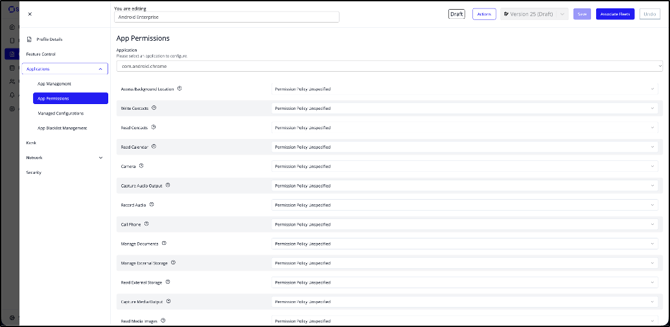This section explains how to control app-level permissions such as Camera, Contacts, or Location. Permissions can be automatically granted, denied, or left for the user to decide. By pre-configuring permissions in the console, you ensure apps function correctly without requiring user input.