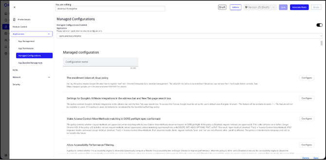 This section explains how to apply advanced policy controls for supported apps. Managed Configurations let IT admins pre-set behaviors such as enforcing Safe Browsing, defining homepages, or blocking URLs. These settings are pushed automatically, so apps are configured correctly upon installation.