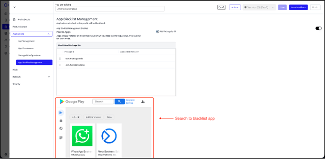 This section explains how to block unwanted apps from being installed or used. By adding apps to the blacklist using Managed Google Play or package IDs, administrators can prevent apps from launching or being reinstalled. This ensures security, compliance, and focus on approved apps only.