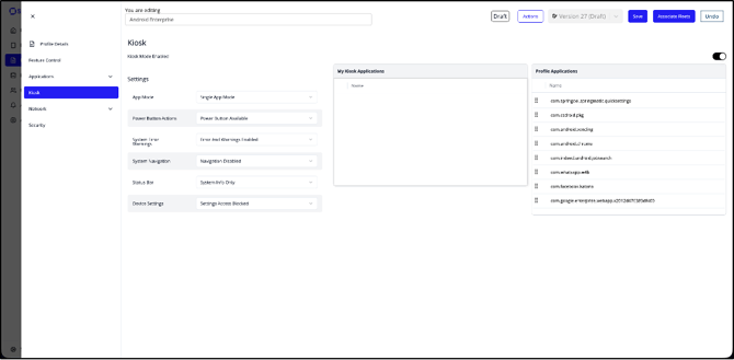 - Once your profile is configured with the desired kiosk mode, associate the profile with the target fleet.